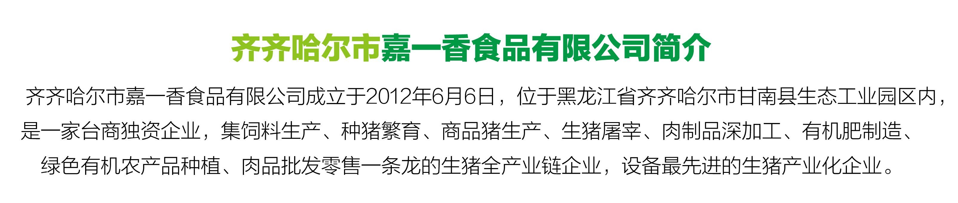 齊齊哈爾市嘉一香食品有限公司隸屬于成立于1984年中國臺(tái)灣臺(tái)北的嘉一香食品股份有限公司。擬在齊齊哈爾市甘南縣生態(tài)工業(yè)園建設(shè)生豬屠宰加工、肉制品及副產(chǎn)品加工項(xiàng)目。齊齊哈爾市甘南縣生態(tài)工業(yè)園區(qū)是2003年組建,坐落在甘南縣城東北2公里,301國道與拉甘公路交匯處,總規(guī)劃面積20平方公里。設(shè)有高科技產(chǎn)業(yè)區(qū),農(nóng)畜產(chǎn)品精深加工區(qū)。機(jī)械、冶金、建材工業(yè)區(qū)、森林觀光和綜合功能區(qū)等五個(gè)區(qū)域,以工業(yè)建設(shè)為主,兼旅游觀光、商服、生活于一體的新型工業(yè)城。